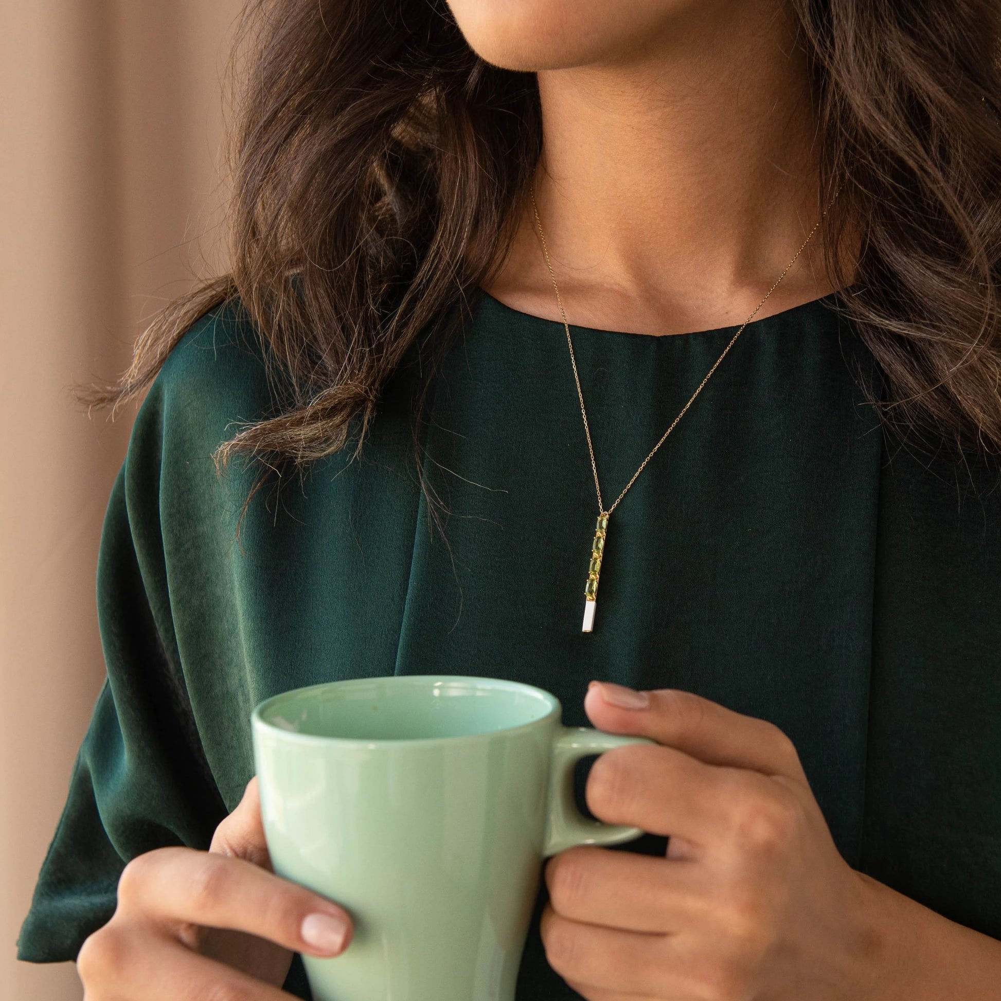 18K Yellow Gold long necklace , gold and white Enamel Bar with green perdote.