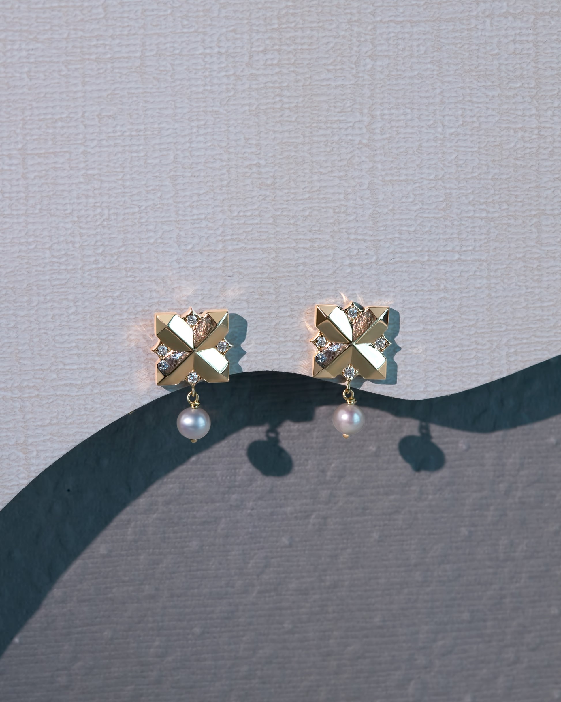حلق الزهره الذهبية عيار 18 مرصع بألماس تتدلى منه حبة اللؤلؤ